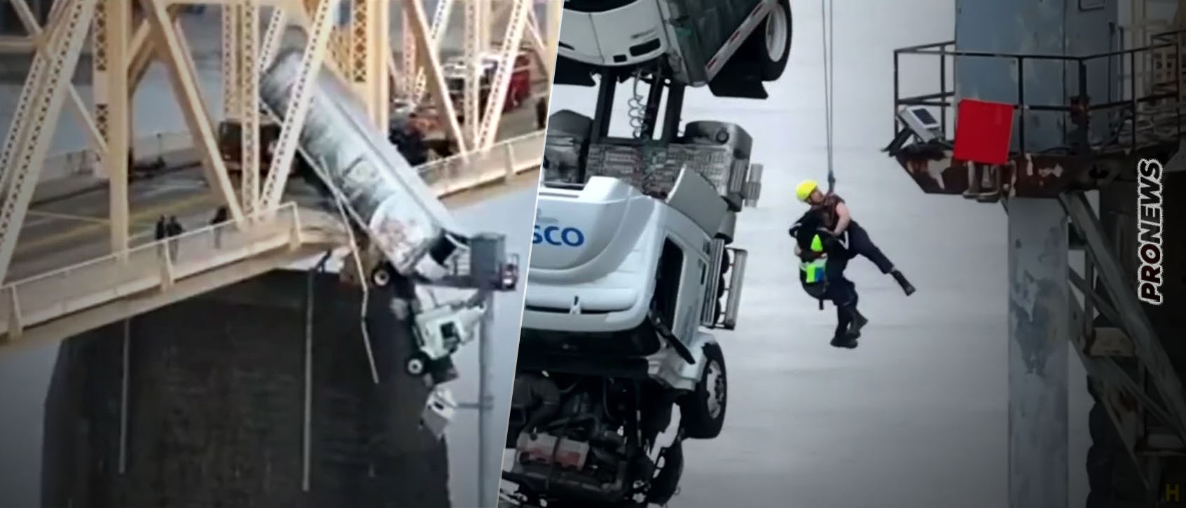 Τα πλάνα που έχουν κάνει τον γύρο του διαδικτύου και δείχνουν ένα μεγάλο φορτηγό να κρέμεται από την γέφυρα Clark Memorial στο Κεντάκι των ΗΠΑ έχουν προκαλέσει σοκ στους θεατές.