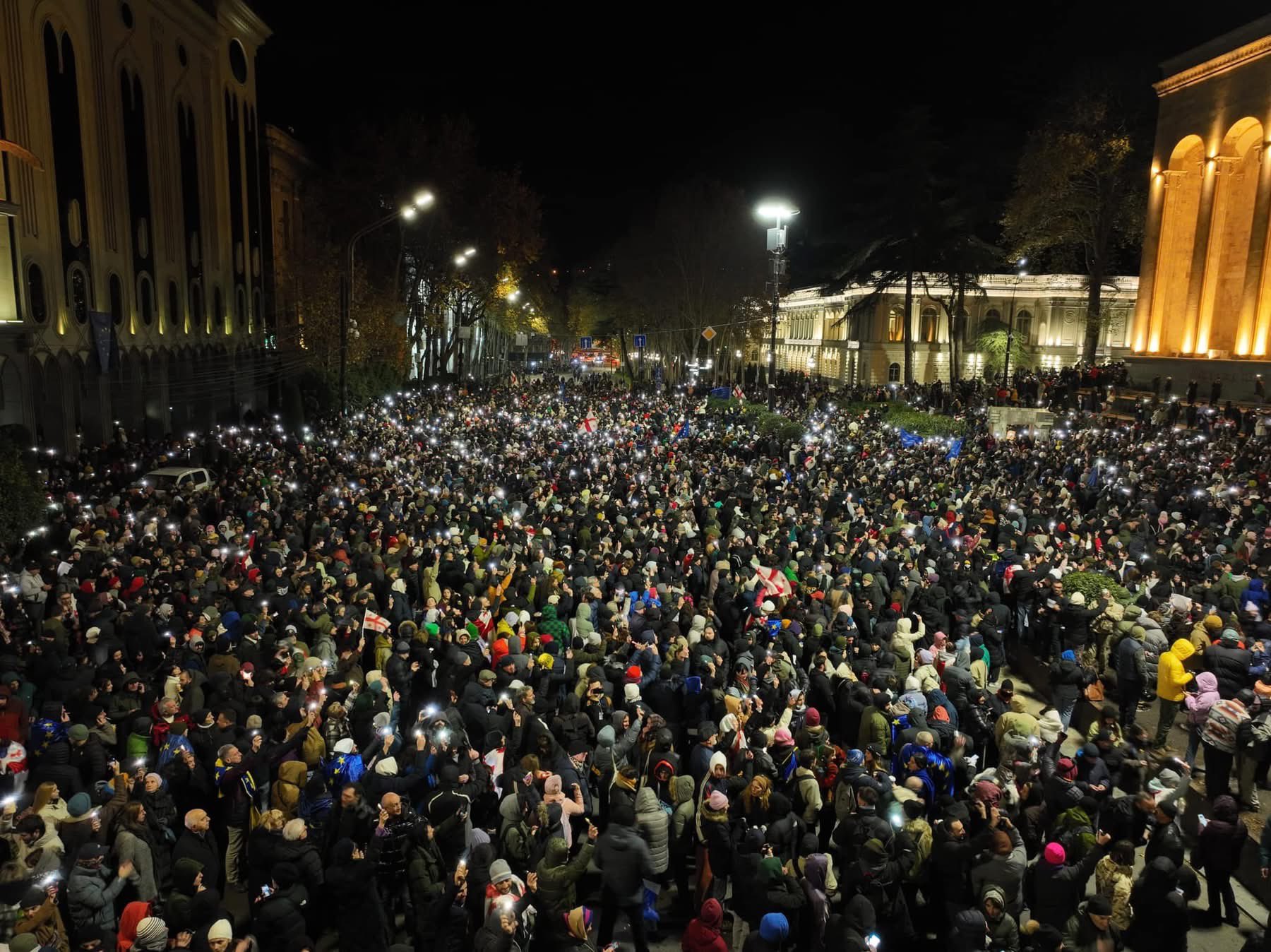 Για δεύτερη συνεχόμενη νύχτα, οι δυνάμεις αποκατάστασης της τάξης χρησιμοποίησαν δακρυγόνα, σπρέι πιπεριού και νερό υπό πίεση για να διαλύσουν μια συγκέντρωση διαμαρτυρίας για την απόφαση της κυβέρνησης της Γεωργίας να αναβάλει μέχρι το 2028 τις ενταξιακές διαπραγματεύσεις με την ΕΕ.