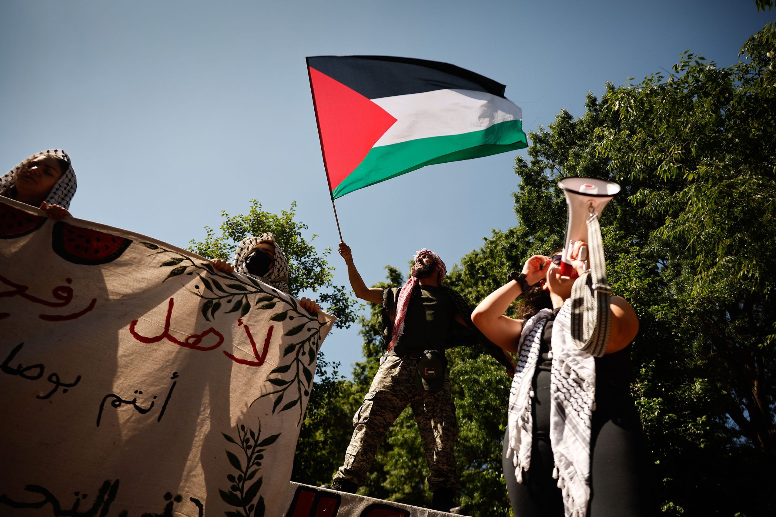 Οι διαμαρτυρίες αυξήθηκαν μετά το στήσιμο σκηνών στον προαύλιο χώρο του Πανεπιστήμιου Κολούμπια στη Νέα Υόρκη που οδήγησε στη σύλληψη περισσότερων από 100 διαδηλωτών στις 18 Απριλίου. Από τότε οι φιλοπαλαιστινιακές διαδηλώσεις επεκτάθηκαν στα πανεπιστήμια σχεδόν όλης της χώρας μεταξύ αυτών σε κορυφαία ιδρύματα όπως το Χαρβαρντ, το Γέιλ, το Μπέρκλεϊ, το Πρίνστον και το UCLA.