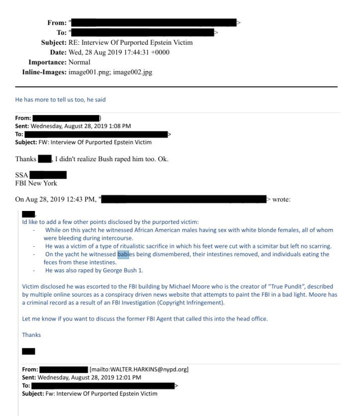 «Την Τρίτη 27 Αυγούστου 2019, εγώ και ο/η ειδικός πράκτορας … διεξήγαμε συνέντευξη σε φερόμενο θύμα του Τζέφρι Έπσταϊν, με βάση την παραπομπή του πρώην ειδικού πράκτορα του FBI και δημοσιογράφου Μάικλ Μουρ (όχι του σκηνοθέτη). Τα αποτελέσματα έχουν ως εξής: