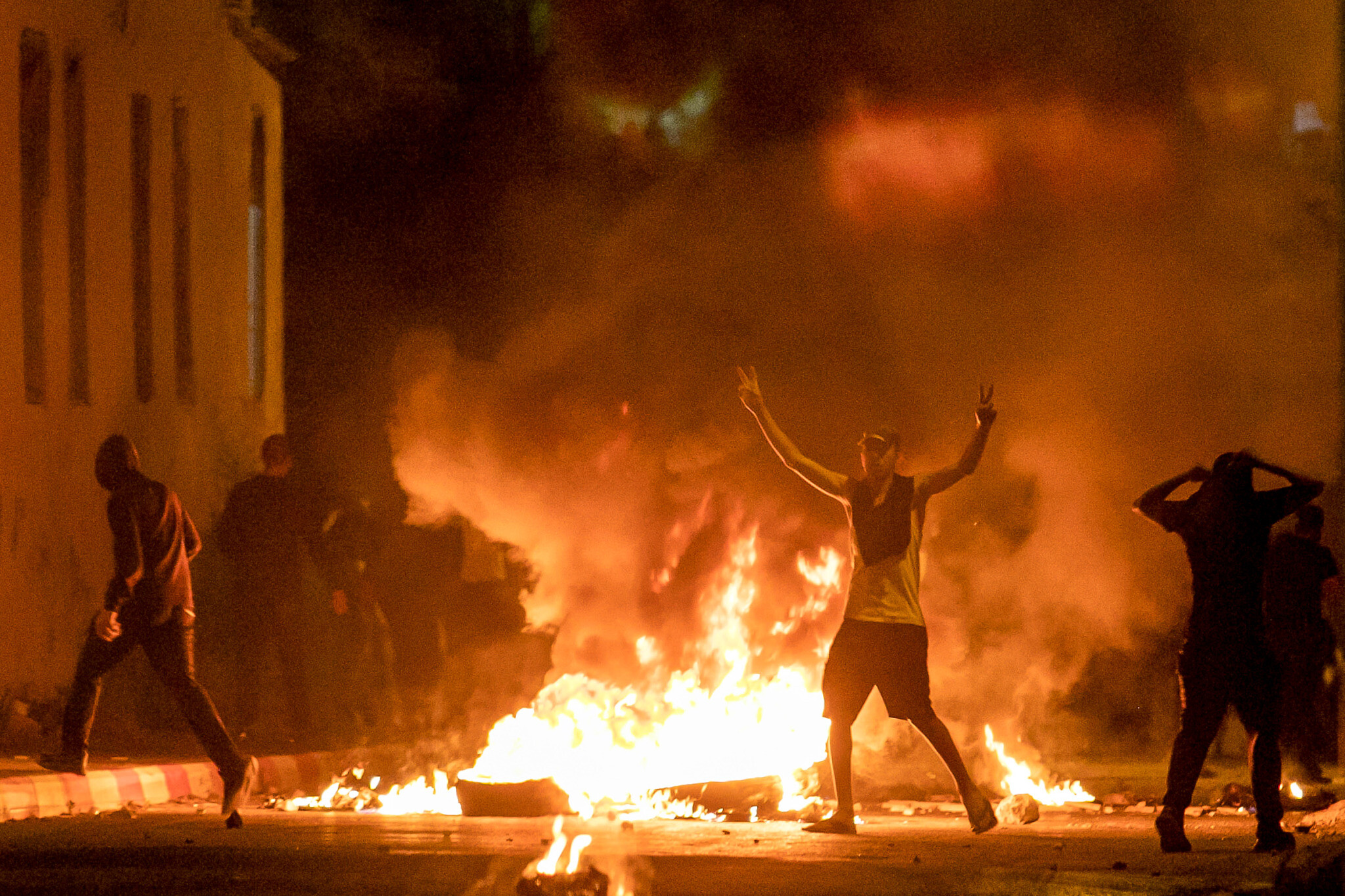 Το τηλεοπτικό υλικό του Reuters δείχνει μεγάλα πλήθη να μπλοκάρουν τον κεντρικό αυτοκινητόδρομο του Τελ Αβίβ καθώς και μια ομάδα διαδηλωτών να ανάβει φωτιά στη μέση του αυτοκινητόδρομου.