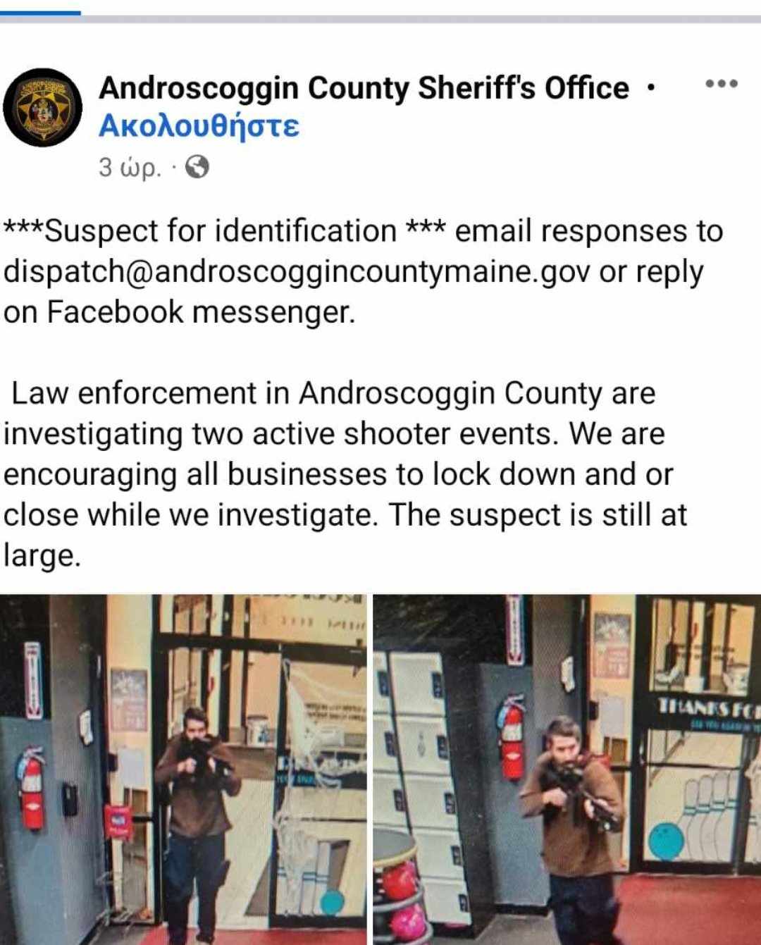 Σύμφωνα με ανάρτηση του αστυνομικού τμήματος του Λούιστον ο  δράστης «θεωρείται οπλισμένος και επικίνδυνος».