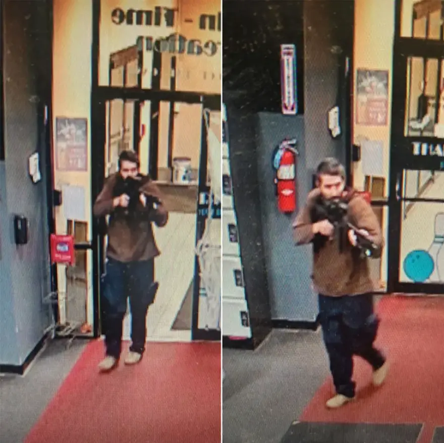 Μια φωτογραφία που εξέδωσε η αστυνομία δείχνει έναν λευκό άνδρα με ένα τουφέκι τύπου AR-15 και ένα οπτικό λέιζερ να εισέρχεται στο κέντρο αναψυχής Sparetime, φορώντας μαύρο στρατιωτικό παντελόνι και καφέ μπλούζα. Το πρόσωπό του φαίνεται καθαρά.
