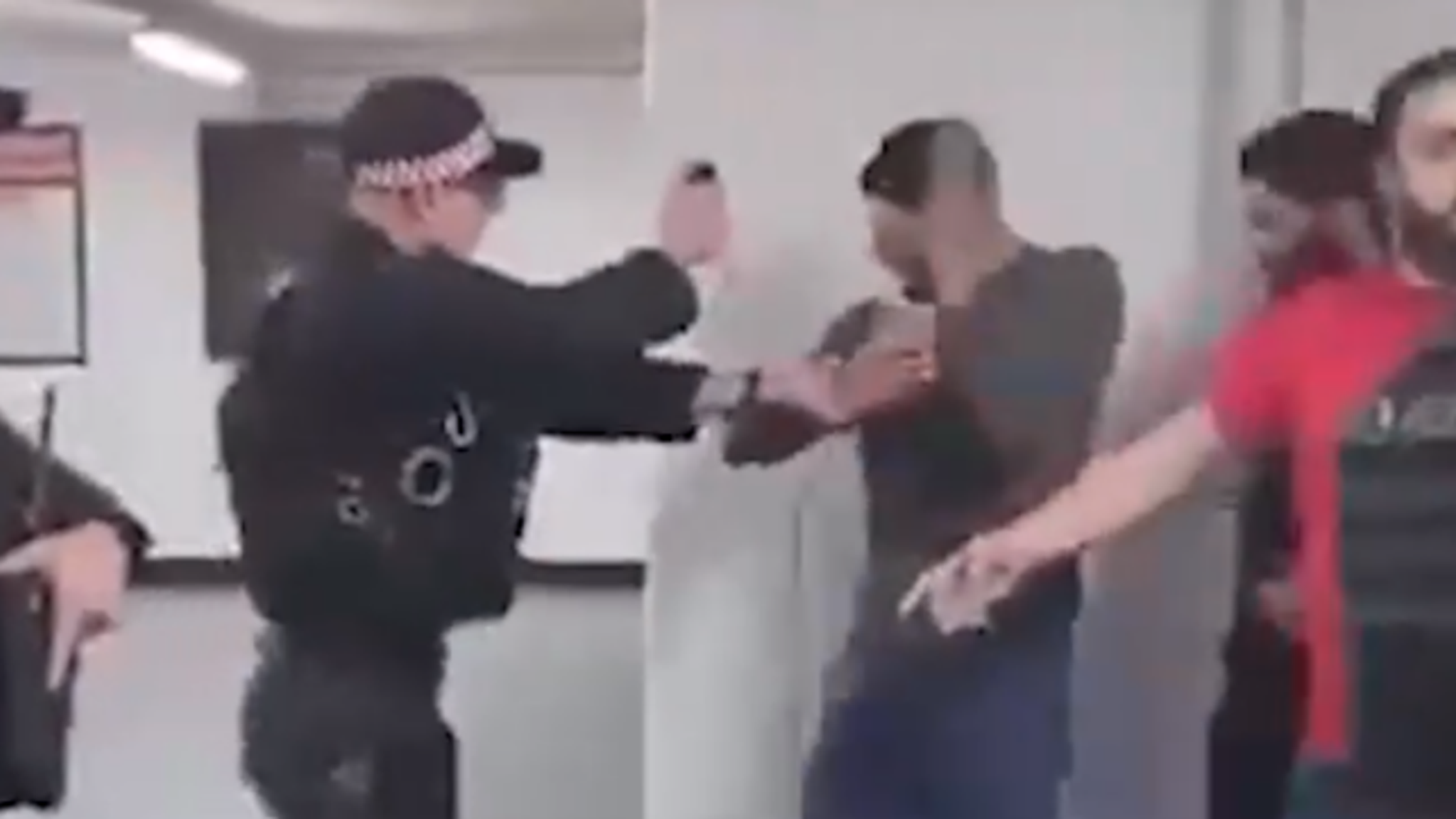 Στη συνέχεια ξεσπά καυγάς – με έναν άλλο άνδρα να αρπάζει έναν από τους αστυνομικούς και να ξεσπούν δύο καυγάδες με γροθιές και από τις δύο πλευρές.