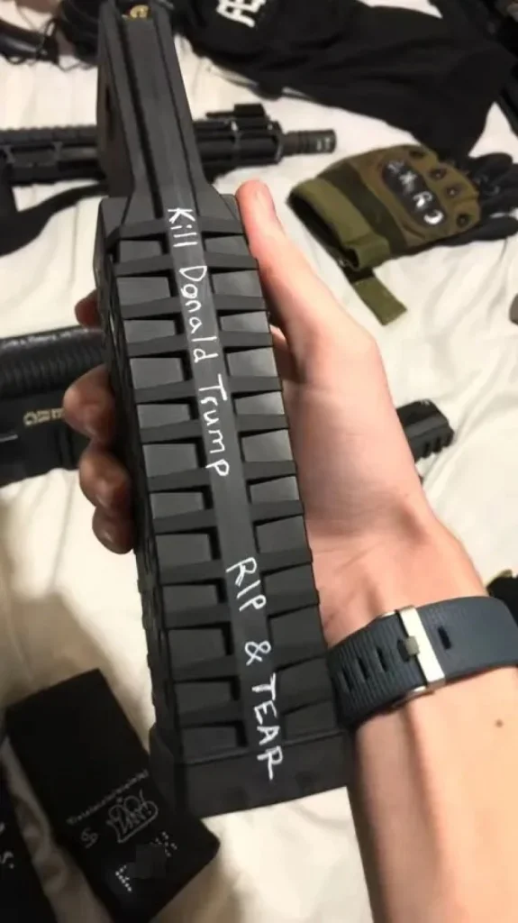 Συγκεκριμένα, στα βίντεο που αναρτήθηκαν σε YouTube και άλλες πλατφόρμες (και κατέβηκαν άμεσα μετά την επίθεση), εμφανίζονται τουφέκια και γεμιστήρες με επιγραφές όπως «για τα παιδιά» και «σκοτώστε τον Ντόναλντ Τραμπ».