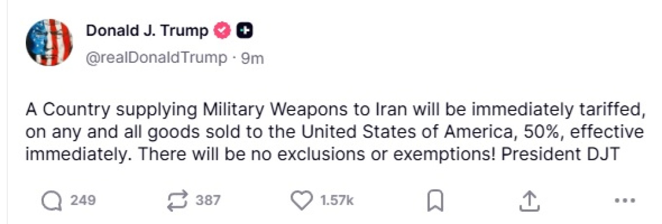 «Οποιαδήποτε χώρα προμηθεύει στρατιωτικά όπλα στο Ιράν θα επιβαρύνεται άμεσα με δασμό 50% σε όλα τα προϊόντα που εξάγει στις Ηνωμένες Πολιτείες. Το μέτρο τίθεται σε ισχύ άμεσα και δεν θα υπάρξουν εξαιρέσεις ή απαλλαγές».
