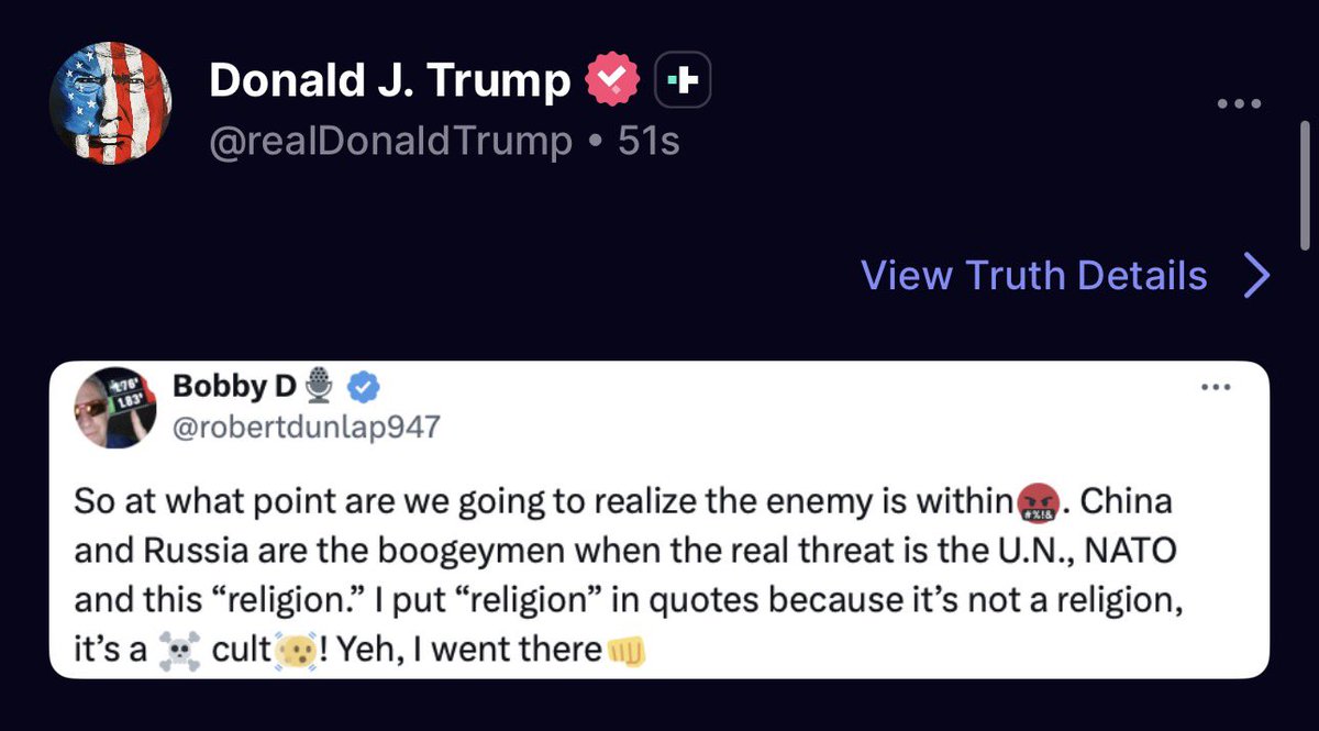Σε μια κίνηση που συμβαδίζει με τις γεωπολιτικές αρχές του προχώρησε ο πρόεδρος των ΗΠΑ Ντόναλντ Τραμπ ο οποίος έκανε like σε μια ανάρτηση ενός άλλου χρήστη στο Truth Social η οποία χαρακτηρίζει όχι τη Ρωσία και την Κίνα, αλλά το ΝΑΤΟ και τον ΟΗΕ ως τους πραγματικούς εχθρούς των Ηνωμένων Πολιτειών.