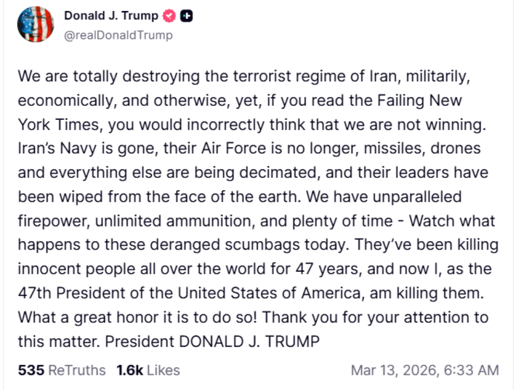 Στην ανάρτησή του ο Τραμπ γράφει, επίσης, «καταστρέφουμε εντελώς το τρομοκρατικό καθεστώς του Ιράν, στρατιωτικά, οικονομικά και με κάθε άλλο τρόπο, όμως, αν διαβάσετε την αποτυχημένη εφημερίδα New York Times, θα νομίζετε λανθασμένα ότι δεν κερδίζουμε.