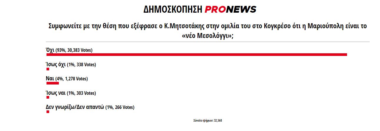Να σημειώσουμε ότι σε μεγάλη δημοσκόπηση του pronews.gr όπου ψήφισαν 32.000 αναγνώστες σε 24 ώρες κατά 93% οι αναγνώστες διαφώνησαν με την θέση που εξέφρασε ο Γ.Μητσοτάκης περί «Νέου Μεσολογγίου» σε ότι αφορά την Μαριούπολη.