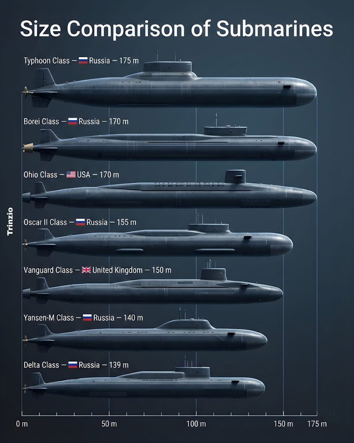 Στοιχεία που ήρθαν στη δημοσιότητα, τα οποία συγκρίνουν τα μήκη επτά μεγάλων κλάσεων πυρηνοκίνητων υποβρυχίων, αναδεικνύουν το ρωσικό Typhoon ως το μεγαλύτερο.