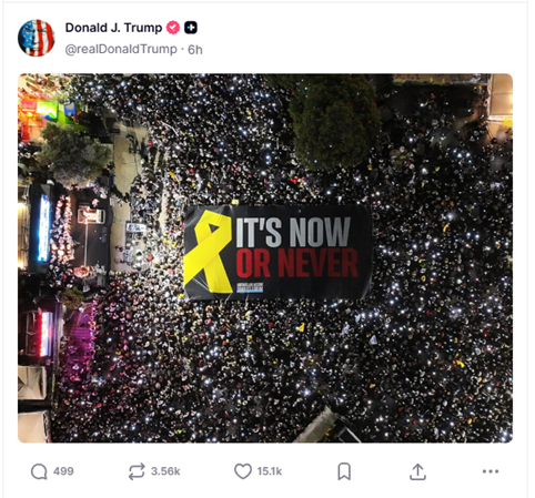 «Τώρα ή Ποτέ»: Η ανάρτηση του Ν.Τραμπ με φωτογραφία από τη συγκέντρωση στην Πλατεία των Ομήρων στο Τελ Αβίβ