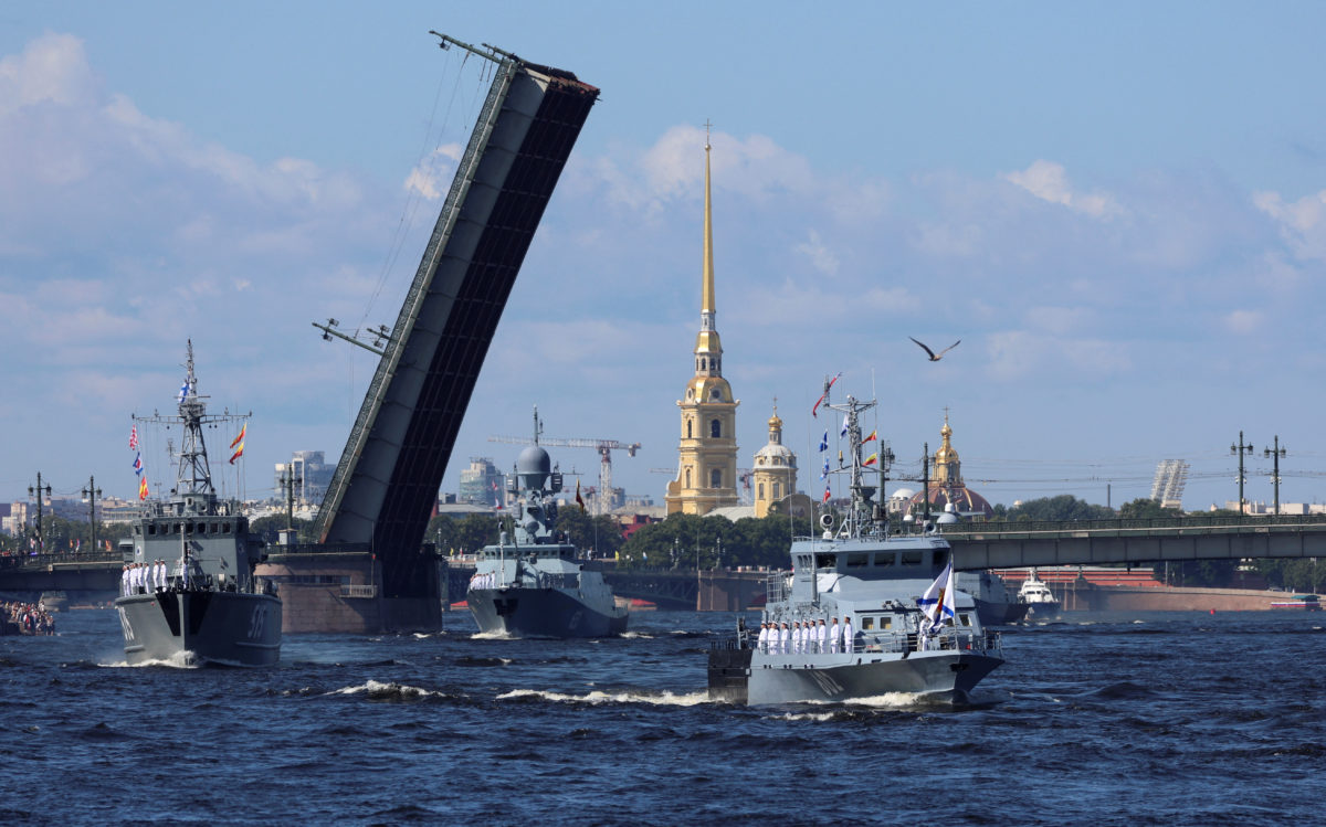 Russian warships, including minesweeper Pavel Khenov and missile corvette Uglich, sail along the Neva River during the annual Navy Day parade in Saint Petersburg, Russia, July 30, 2023. REUTERS/Anton Vaganov