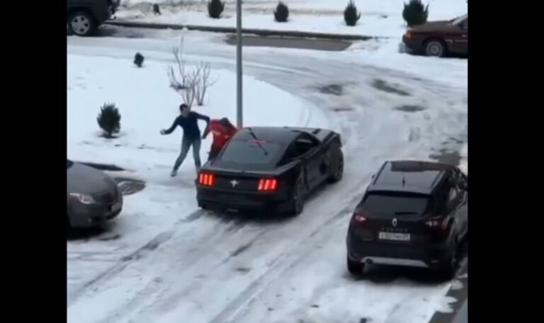 Βίντεο που δημοσιεύθηκε καταγράφει τη στιγμή που μια μαύρη Mustang κινείται ανεξέλεγκτα σε χιονισμένο δρόμο, ακολουθώντας μια επικίνδυνη και ανεξέλεγκτη πορεία μέχρι να ακινητοποιηθεί.