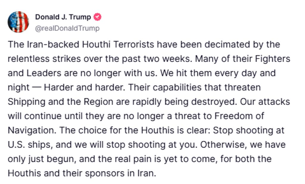 «Οι υποστηριζόμενοι από το Ιράν τρομοκράτες Χούθι έχουν αποδεκατιστεί από τα αμείλικτα πλήγματα των τελευταίων δύο εβδομάδων», αναφέρει ο Τραμπ σε ανάρτησή του στην πλατφόρμα Truth Social.