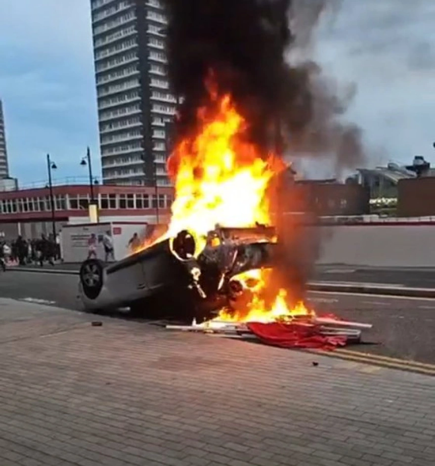 Διαδηλωτές ανέτρεψαν ένα αυτοκίνητο προτού το πυρπολήσουν στο κέντρο της πόλης του Σάντερλαντ, ενώ άλλοι επιτέθηκαν σε ένοπλους αστυνομικούς.