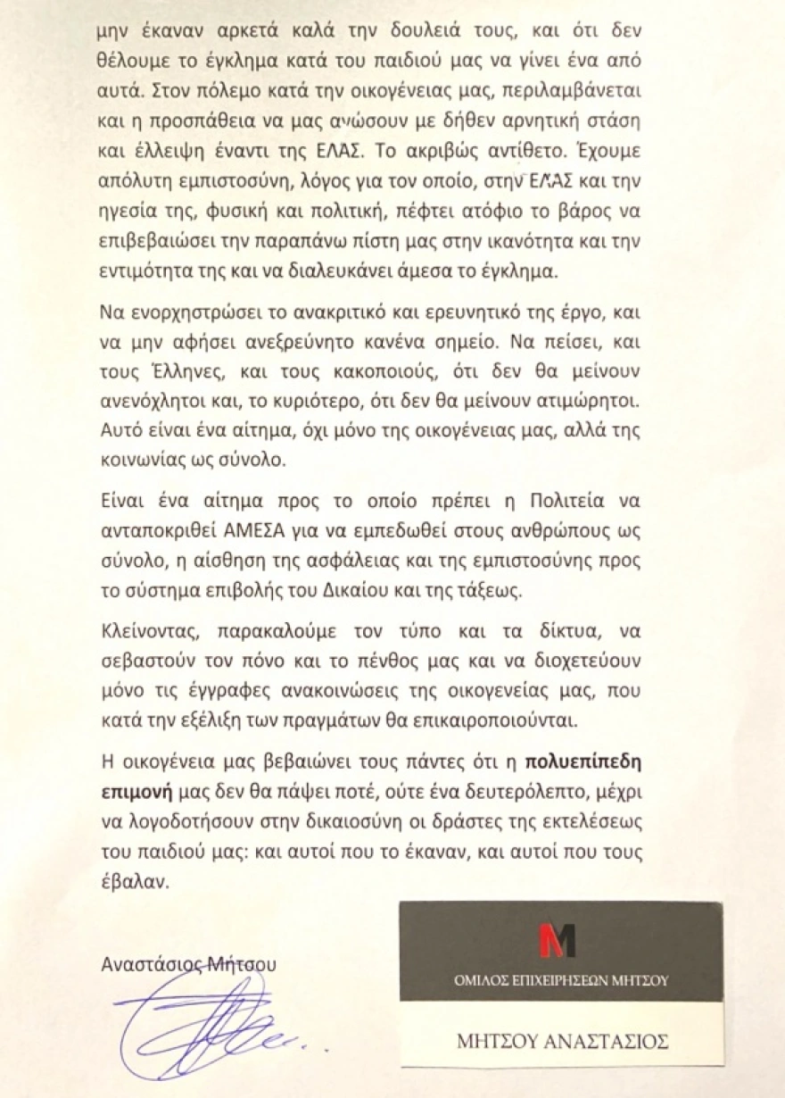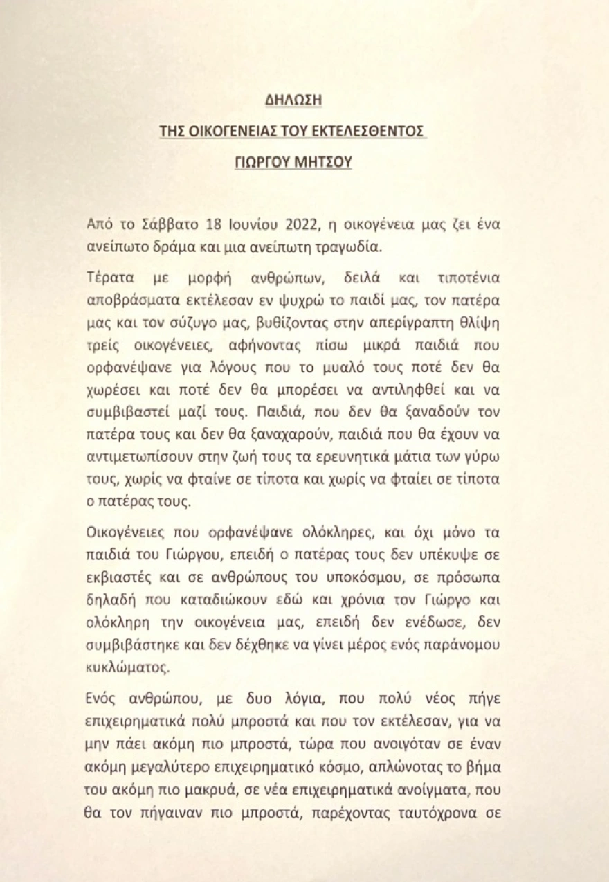 Η οικογένεια του 38χρονου ιδιοκτήτη βενζινάδικου στον Γέρακα, που δολοφονήθηκε εν ψυχρώ το Σάββατο 18 Ιουνίου, τονίζει σε δήλωσή της, πως ο Γιώργος Μήτσος «δεν υπέκυψε σε εκβιαστές και σε ανθρώπους του υποκόσμου, σε πρόσωπα δηλαδή που τον καταδιώκουν εδώ και χρόνια, (…) επειδή δεν ενέδωσε, δεν συμβιβάστηκε και δεν δέχθηκε να γίνει μέρος ενός παράνομου κυκλώματος».
