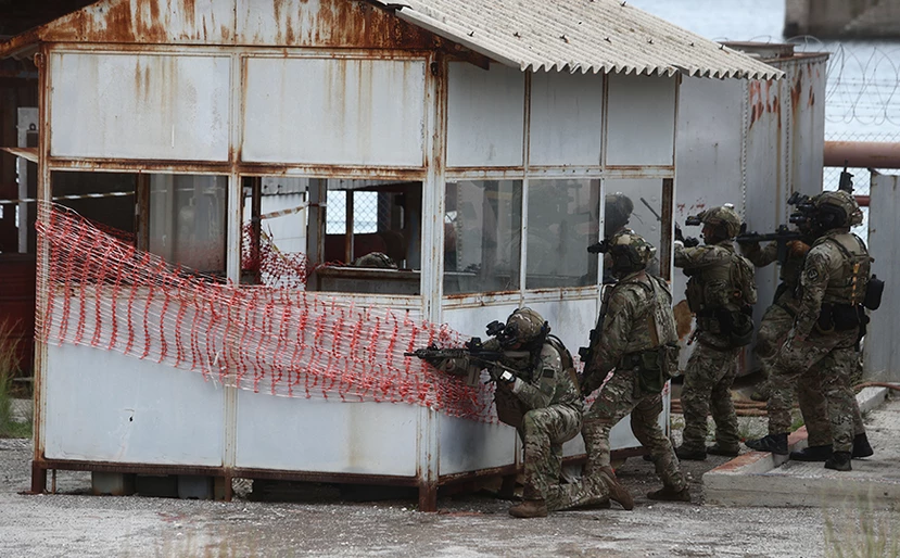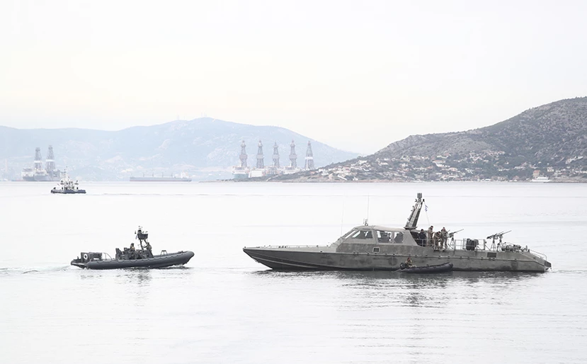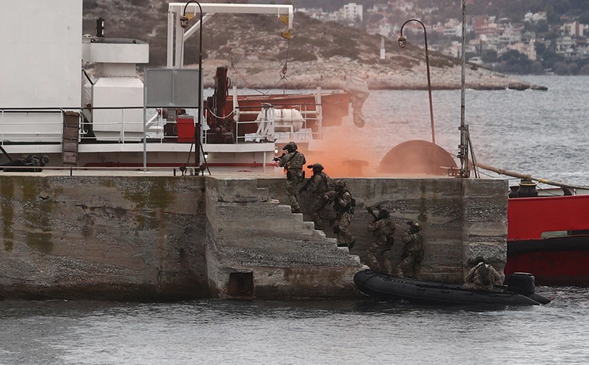 Στη θάλασσα, ομάδα εφόδου των δυνάμεων ειδικών επιχειρήσεων προχωρά με τη μέθοδο Fast Rope από ελικόπτερο Seahawk με την κάλυψη σκαφών, σε μη συναινετική νηοψία σε πλοίο που προσεγγίζει την εγκατάσταση της Ρεβυθούσας.