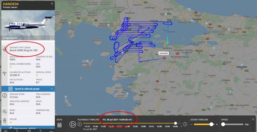 Συγκεκριμένα τουρκικά αεροσκάφη KINGAIR 350 που απογειώθηκαν από το αεροδρόμιο της BANDIRMA, σαρώνουν όπως φαίνεται στον χάρτη τα Στενά αλλά και την περιοχή του Έβρου. Αυτού του τύπου αεροσκάφη χρησιμοποιεί η τουρκική μυστική υπηρεσία MIT.