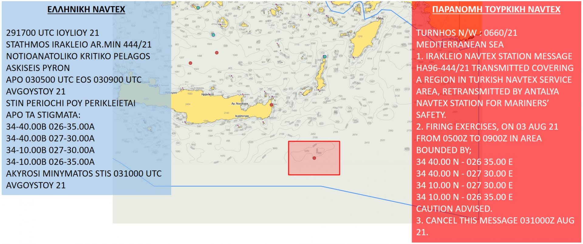Παράλληλα εντός της ελληνικής ΑΟΖ Νότια της Κρήτης, οι Τούρκοι συνεχίζουν να προκαλούν με παράνομες NAVTEX, όπως η παρακάτω, η οποία υποτίθεται ότι «ακυρώνει» ελληνική NAVTEX για άσκηση με πραγματικά πυρά στην περιοχή.