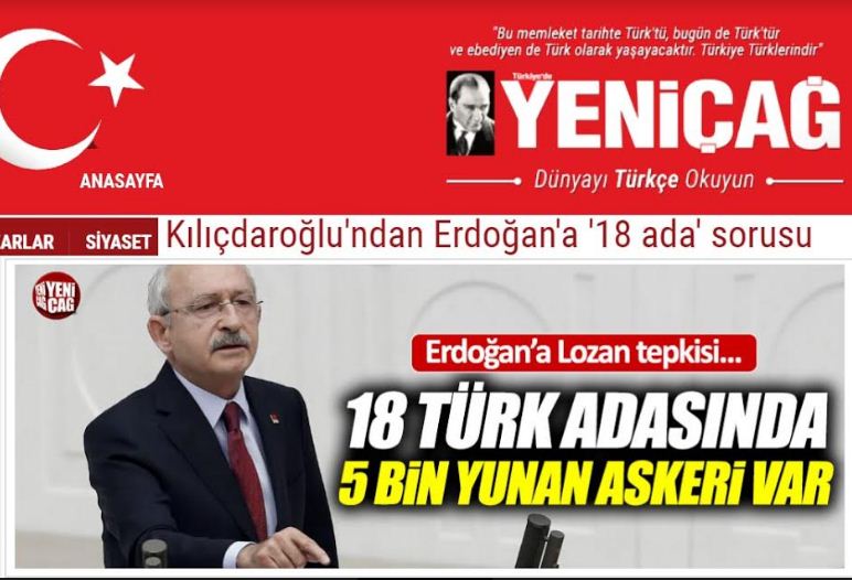 «Θέλω να ρωτήσω τον κ. Ερντογάν: Γιατί εκεί δεν είπες τίποτα για τα 18 νησιά; Γιατί δεν ανέφερε τίποτα για τα 18 νησιά που βρίσκονται υπό κατάληψη; Αντί να ζητάει πίσω τα 18 νησιά του Αιγαίου, που έχει παράνομα καταλάβει η Ελλάδα, έκανε δηλώσεις για επικαιροποίηση της Συνθήκης της Λωζάνης», δήλωσε προκλητικά την Δευτέρα ο Κιλιτσντάρογλου, επικρίνοντας την προσπάθεια Ερντογάν να αλλάξει το status quo της Συνθήκης της Λωζάννης, σύμφωνα με την οποία καθορίστηκαν τα σημερινά σύνορα της Τουρκίας.