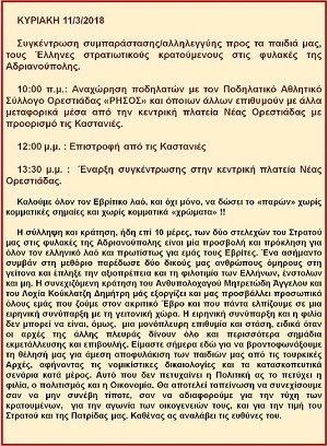 Με αφορμή την αιχμαλωσία των δύο Ελλήνων στρατιωτικών στην Τουρκία την ερχόμενη Κυριακή 11 Μαρτίου το μεσημέρι στην Ορεστιάδα θα διοργανωθεί συλλαλητήριο υπέρ των στελεχών του Στρατού.