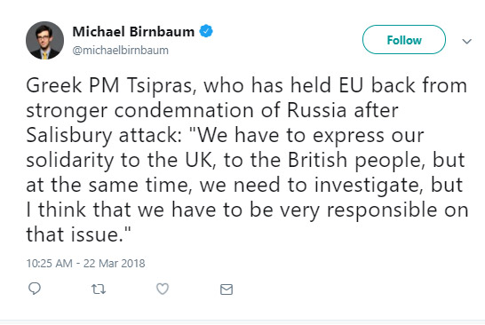 Kατά της καταδίκης της Ρωσίας για την δηλητηρίαση του Ρώσου πρώην διπλού πράκτορα Σ.Σκριπάλ, τάχθηκε ο Έλληνας πρωθυπουργός Α.Τσίπρας λίγο μετά την τηλεφωνική συνομιλία που είχε με τον Ρώσο πρόεδρο Β.Πούτιν από τον οποίο ζήτησε την παρέμβασή του για τους 2 Έλληνες αιχμάλωτους στρατιωτικούς.
