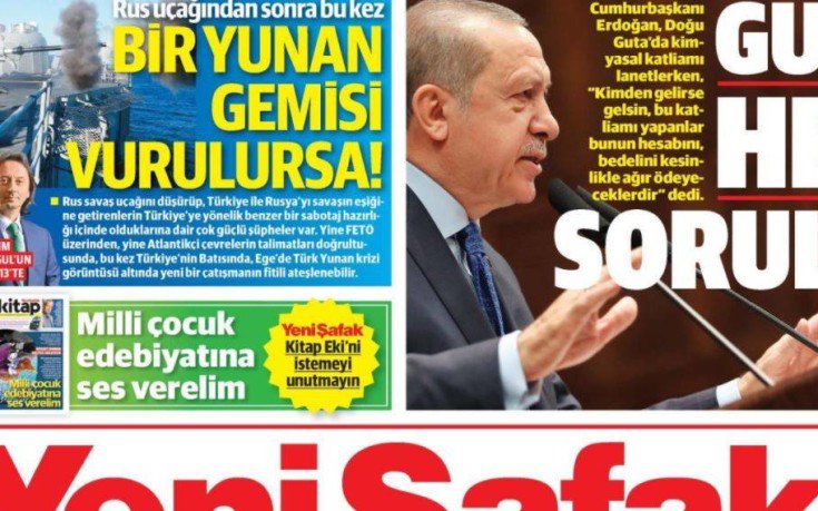 Το επαναλαβμάνουμε ο Ιμπραήμ Καραγκιούλ δεν είναι απλά ένας αρθρογράφος αλλά κάποιος ο οποίος συνδέεται άμεσα με τον Τούρκο πρόεδρο και σήμερα στο πρωτοσέλιδο της Yeni Safak φιγουράρει σε περίοπτη θέση ο τίτλος «Τι θα συμβεί αν βυθιστεί ένα ελληνικό πλοίο στο Αιγαίο».