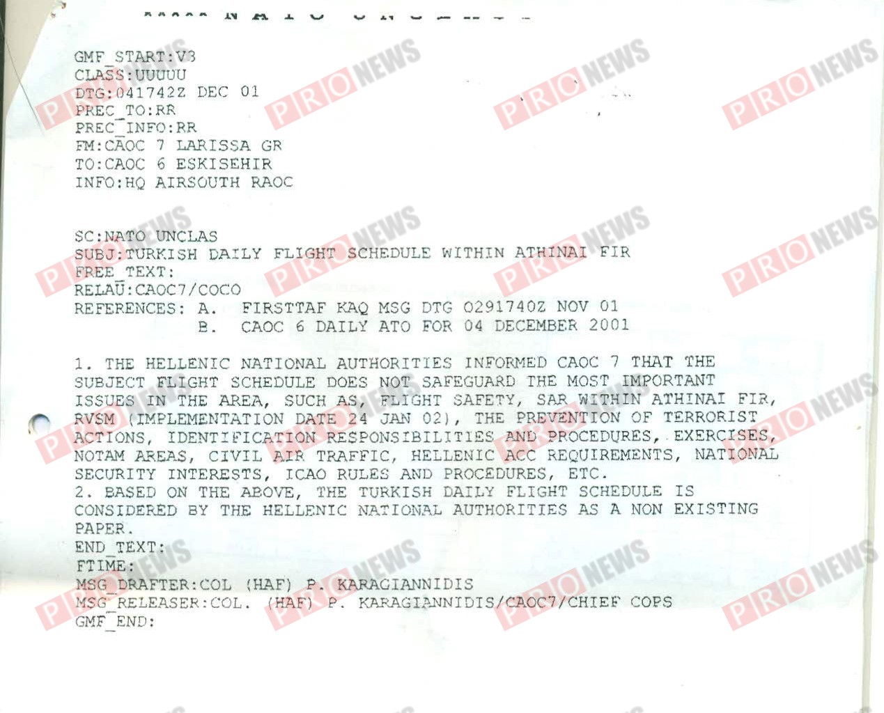 Επομένως, η αποδοχή από ελληνικής πλευράς οποιουδήποτε τουρκικού αιτήματος (προφορικού η γραπτού) για πτήσεις τουρκικών στρατιωτικών αεροσκαφών στον διεθνή εναέριο χώρο του FIR Αθηνών χωρίς κατάθεση σχεδίων πτήσης, ισοδυναμεί με παραχώρηση του Αιγαίου εντός του FIR Αθηνών και ταυτίζεται με τις επιθετικές διεκδικήσεις της Τουρκίας σε βάρος της Ελλάδας.
