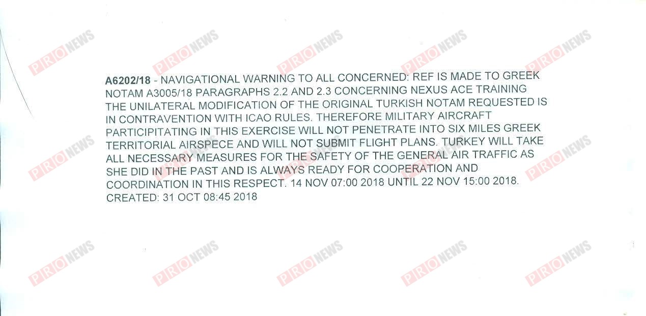 Το pronews.gr αναφέρεται, για παράδειγμα, σε τουρκικές διεθνείς αγγελίες ΝΟΤΑΜ Α6256/18 και Α 6202/18 που έχουν ισχύ μέχρι και 22 Νοεμβρίου 2018, με τις οποίες η Άγκυρα δηλώνει διεθνώς ότι τα τουρκικά στρατιωτικά αεροσκάφη δεν θα καταθέτουν σχέδια πτήσης, δηλαδή η Άγκυρα δεν αναγνωρίζει στην Ελλάδα αρμοδιότητες ελέγχου για το FIR Aθηνών, ούτε αρμοδιότητες SAR ούτε κυριαρχία, ούτε στα 10νμ ΕΕΧ, αλλά μόνον στα 6νμ, ούτε και το ίδιο το FIR Αθηνών/Κων/λης.