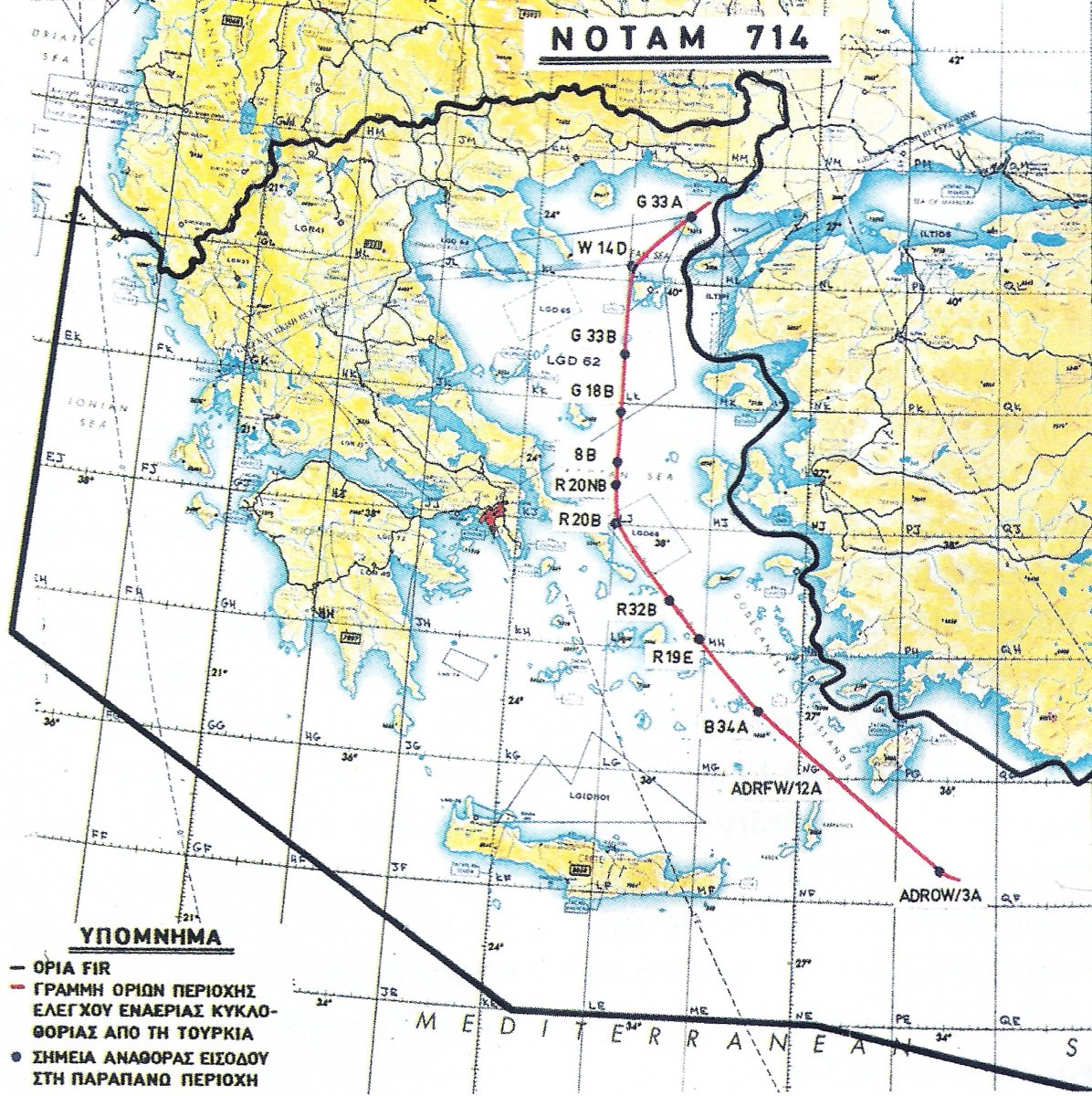 Με την κόκκινη γραμμή φαίνεται η αυθαίρετη ΝΟΤΑΜ 714 (“ειδοποίηση προς αεροναυτιλομένους”)την οποία εξέδωσε η Τουρκία τον Αύγουστο του 1974 με την οποία προσπαθούσε να επεκτείνει τον χώρο της δικαιοδοσίας της μέχρι το μέσο του Αιγαίου εντός του FIR Αθηνών. Η Ελλάδα τότε κήρυξε το Αιγαίο επικίνδυνη περιοχή (NOTAM 1157).