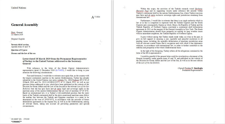Πρώτα απ ‘όλα, θα ήθελα να επαναλάβω ότι η Τουρκία, ως χώρα με τις μεγαλύτερες ηπειρωτικές ακτές της Ανατολικής Μεσογείου, έχει ήδη υποβληθεί στα Ηνωμένα Έθνη (βλ. Σημειώσεις verbales 2004 / Turkuno DT / 4739 της 2ας Μαρτίου 2004 και αριθ. 2013/14136816/22273 της 12ης Μαρτίου 2013, καθώς και τις προηγούμενες επιστολές που απευθύνω σε εσάς, οι οποίες έχουν δημοσιευτεί στον ιστότοπο της Διεύθυνσης Θαλάσσιων Υποθέσεων και Δικαίου της Θάλασσας και στο σχετικό Δίκαιο της Θάλασσας Δελτία) ότι έχει ipso facto και ab initio νομικά και κυριαρχικά δικαιώματα στις θαλάσσιες περιοχές της ανατολικής Μεσογείου που βρίσκονται δυτικά του μεσημβρινού 32 ° 16’18 “E.