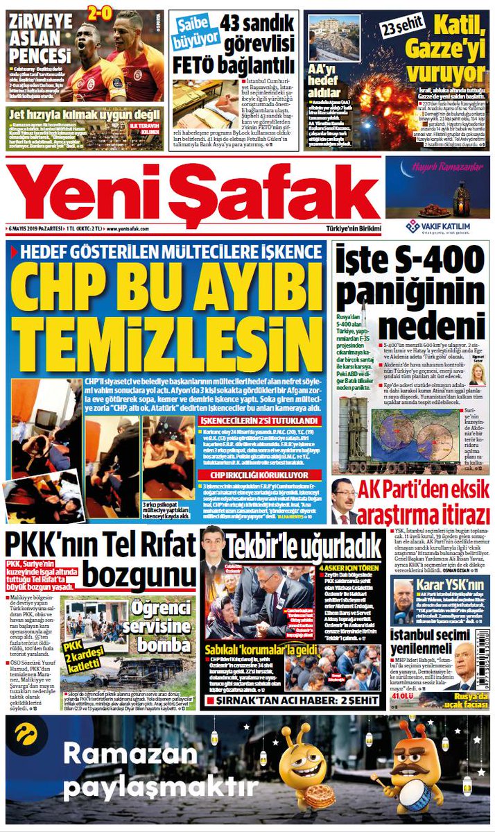 Η τουρκική εφημερίδα yeni safak, φερέφωνο του ΡΤ.Ερντογάν “εκπέμπει” διαρκώς πολεμικά μηνύματα με αποκορύφωμα το σημερινό της πρωτοσέλιδο σύμφωνα με το οποίο το “Αιγαίο και η ανατολική Μεσόγειος θα μετραταπούν σε τουρκικές λίμνες”.