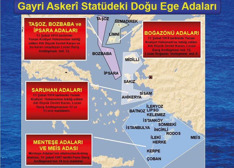 “Ως αποτέλεσμα της Συνθήκης της Λοζάνης του 1923 και της Συνθήκης των Παρισίων του 1947, συνολικά 23 νησιά σε Αιγαίο και ανατολική Μεσόγειο πρέπει να είναι αποστρατικοποιημένα.