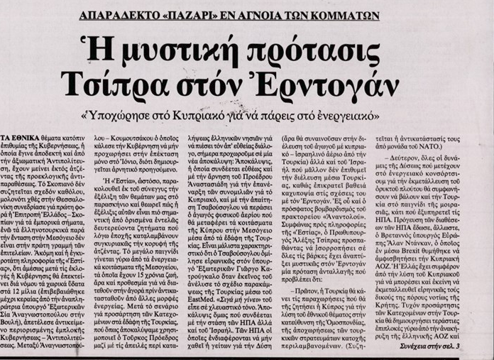 Αυτό αποκαλύπτει η εφημερίδα «ΕΣΤΙΑ» σε δημοσίευμά της στο οποίο τονίζει «Ο Ελληνας πρωθυπουργός, Αλέξης Τσίπρας φαίνεται να έχει προτείνει στον Ρετζέπ Ταγίπ Ερντογάν τα εξής: