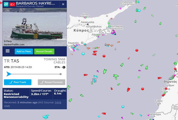 Η Τουρκία υλοποίησε τη NAVTEX 0915/19 που εξέδωσε την περασμένη εβδομάδα και έστειλε το ερευνητικό σκάφος Barbaros νότια της Κύπρου. Σύμφωνα με αυτήν, το τουρκικό σκάφος, το οποίο βρίσκεται από χθες στην κυπριακή ΑΟΖ, θα μείνει στην περιοχή αυτή μέχρι το τέλος Δεκεμβρίου.