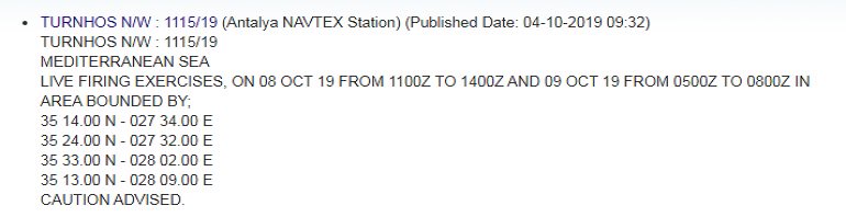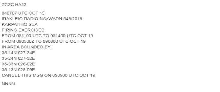 Παράλληλα η Τουρκία μέσω του σταθμού της Αττάλειας και πάλι, που δεν έχει καμιά σχετική δικαιοδοσία, εξέδωσε και NAVTEX για άσκηση του δικού της Ναυτικού με πραγματικά μάλιστα πυρά όπως επισημαίνεται, ακόμα πιο κοντά στην Κάρπαθο και συγκεκριμένα στα διεθνή ύδατα νοτιοανατολικά της και σε απόσταση κάτι περισσότερο από από 13 ναυτικά μίλια.