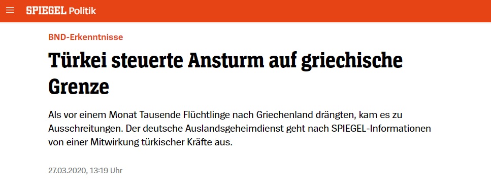 Στο τέλος Φεβρουαρίου, όπως αναφέρει το γερμανικό περιοδικό, ο πρόεδρος της Τουρκίας Ρετζέπ Ταγίπ Ερντογάν ανακοίνωσε ότι ανοίγει τα σύνορα με την ΕΕ .Τότε χιλιάδες παράνομοι μετανάστες προσπάθησαν να φτάσουν στην Ελλάδα.