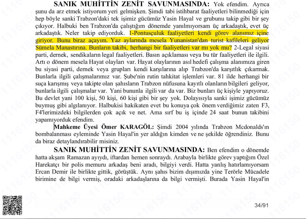 ¨Η παρακολούθηση των ποντιακών δραστηριοτήτων του Πόντου, ήταν μέρος της εντολής μας… για παράδειγμα, γκρουπ τουριστών από την Ελλάδα που επισκέπτονται το Μοναστήρι της Σουμελά (ένα ελληνικό ορθόδοξο μοναστήρι του 4ου αιώνα στο Τραπεζούντα)¨, είπε ο Ζενίτ, προσθέτοντας ότι αυτός και άλλοι αξιωματικοί πληροφοριών παρακολουθούσαν τους Έλληνες τουρίστες.