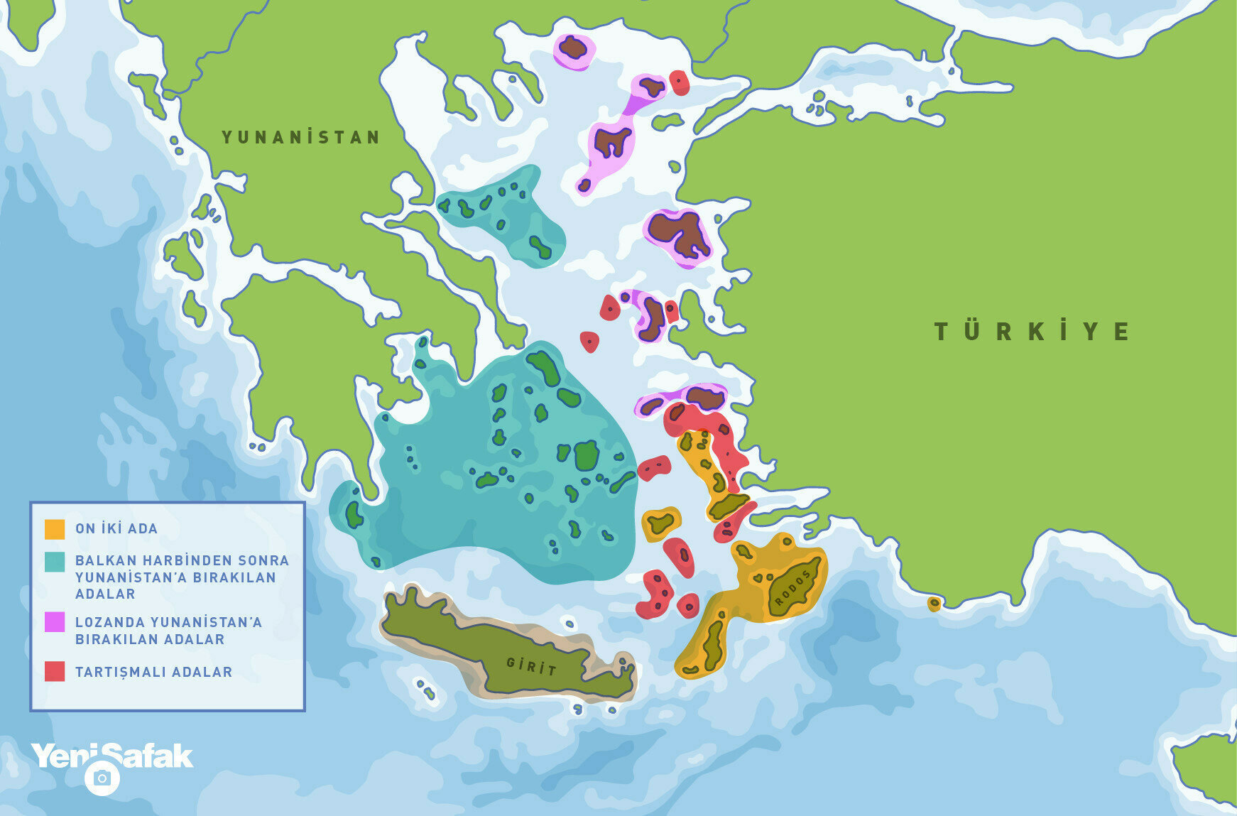 Οι περιοχές κυριαρχίας και θαλάσσιας δικαιοδοσίας όπως και ο εναέριος χώρος των νησιών Θάσος, Σαμοθράκη, Λήμνος, Λέσβος, Χίος, Σάμος, Ικαρία, Ψαρά και Άγιος Ευστράτιος παρέμειναν στην Τουρκία. Επίσης με το άρθρο 13 της συνθήκης της Λωζάννης αποφασίστηκε ότι η Ελλάδα δεν θα χρησιμοποιήσει τα νησιά για στρατιωτικούς σκοπούς» αναφέρει ο Γιαλίμ, φτάνοντας προκλητικά στο σημείο να ζητήσει την… εκκένωση εννέα ελληνικών νησιών και παράδοσή τους στην Τουρκία.