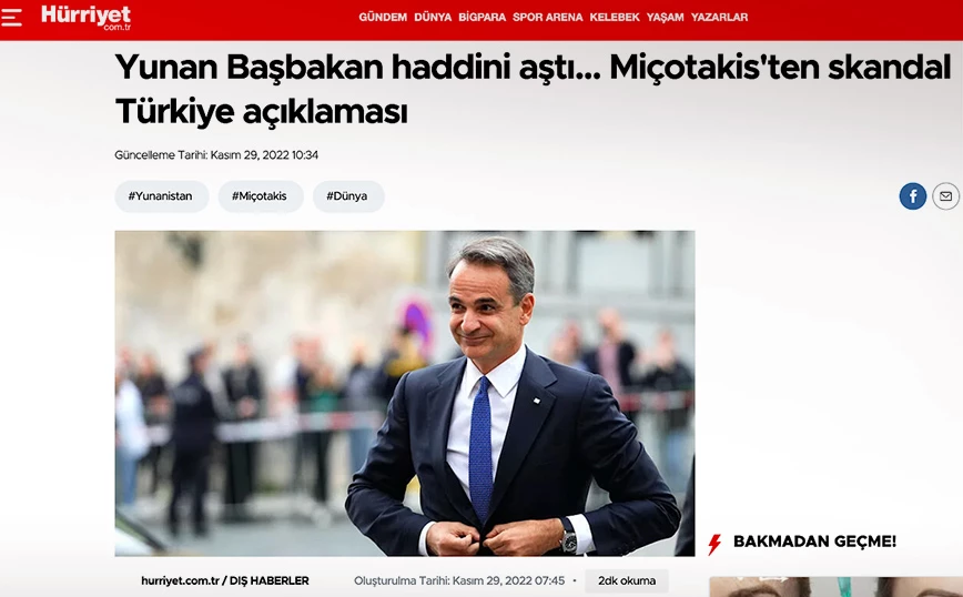 Με τίτλο «Ο Έλληνας πρωθυπουργός ξεπέρασε τα όρια. Σκανδαλώδεις δηλώσεις από Μητσοτάκη για την Τουρκία», η φιλοκυβερνητική εφημερίδα Hurriyet, επιτίθεται κατά του προέδρου της ελληνικής κυβέρνησης, λόγω των τελευταίων δηλώσεών του στο London School of Economics.
