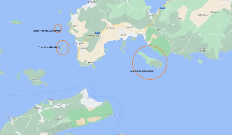 Συγκεκριμένα πρόκειται για τα νησιά Τσατάλια (Gatalada), δυτικά της χερσονήσου της Αλικαρνασού και 8 χλμ από την Ψέριμο, καθώς και τους Άγιους Απόστολους (Gavus) ανατολικά των Ιμίων, που οι τουρκικές Αρχές εγκατέστησαν τα τελευταία χρόνια στρατιωτικό φυλάκιο παρατήρησης.