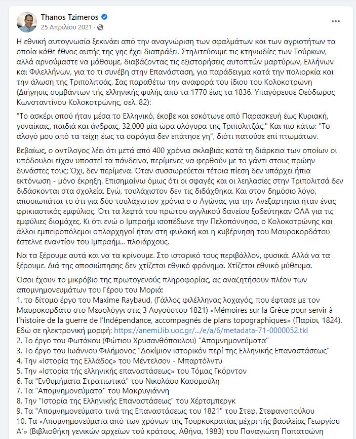 Ομοίως, θα ήταν ωφέλιμο για όσους ισχυρίζονται αυτούς τους ισχυρισμούς να θυμούνται τα βάναυσα εγκλήματα και τις φρικαλεότητες που διαπράχθηκαν εναντίον άλλων θρησκευτικών ή εθνοτικών ομάδων, ιδιαίτερα των Τούρκων, συμπεριλαμβανομένης της σφαγής της Τριπολιτσάς το 1821.