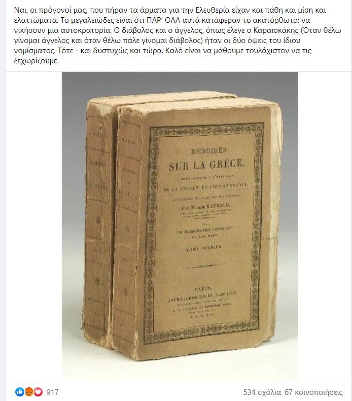«Η εθνική αυτογνωσία ξεκινάει από την αναγνώριση των σφαλμάτων και των αγριοτήτων τα οποία κάθε έθνος αυτής της γης έχει διαπράξει. Στηλιτεύουμε τις κτηνωδίες των Τούρκων, αλλά αρνούμαστε να μάθουμε, διαβάζοντας τις εξιστορήσεις αυτοπτών μαρτύρων, Ελλήνων και φιλελλήνων, για το τι συνέβη στην Επανάσταση, για παράδειγμα, κατά την πολιορκία και την άλωση της Τριπολιτσάς».