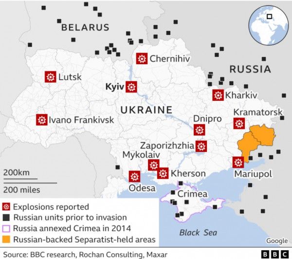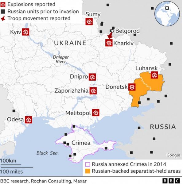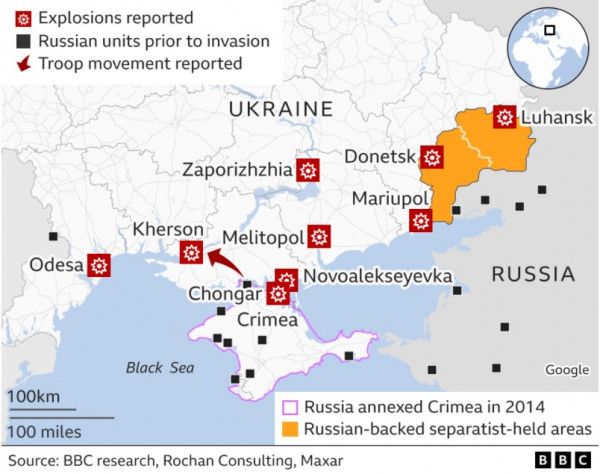 Οι χάρτες που παρουσιάζει το BBC δείχνουν την ανάπτυξη του ρωσικού στρατού από τα ανατολικά μέσω του Ντονιέτσκ, του Λουγκάνσκ και του Χάρκοβο και από την Κριμαία στα νότια.