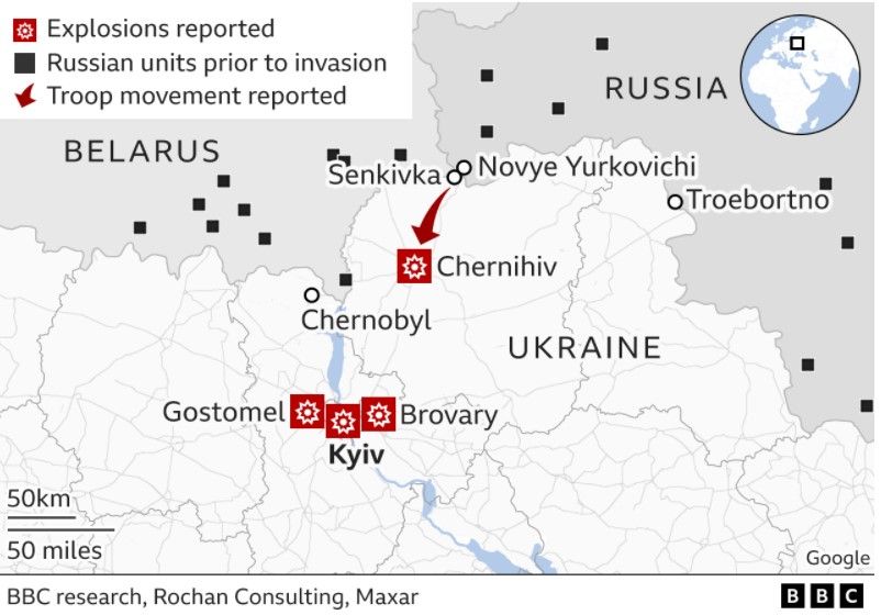Τεθωρακισμένες φάλαγγες, συμπεριλαμβανομένων αρμάτων μάχης και πυραυλικών συστημάτων πολλαπλών εκτοξεύσεων, έχουν κινηθεί προς το Τσερνίχοφ, σε απευθείας πορεία προς το Κίεβο.