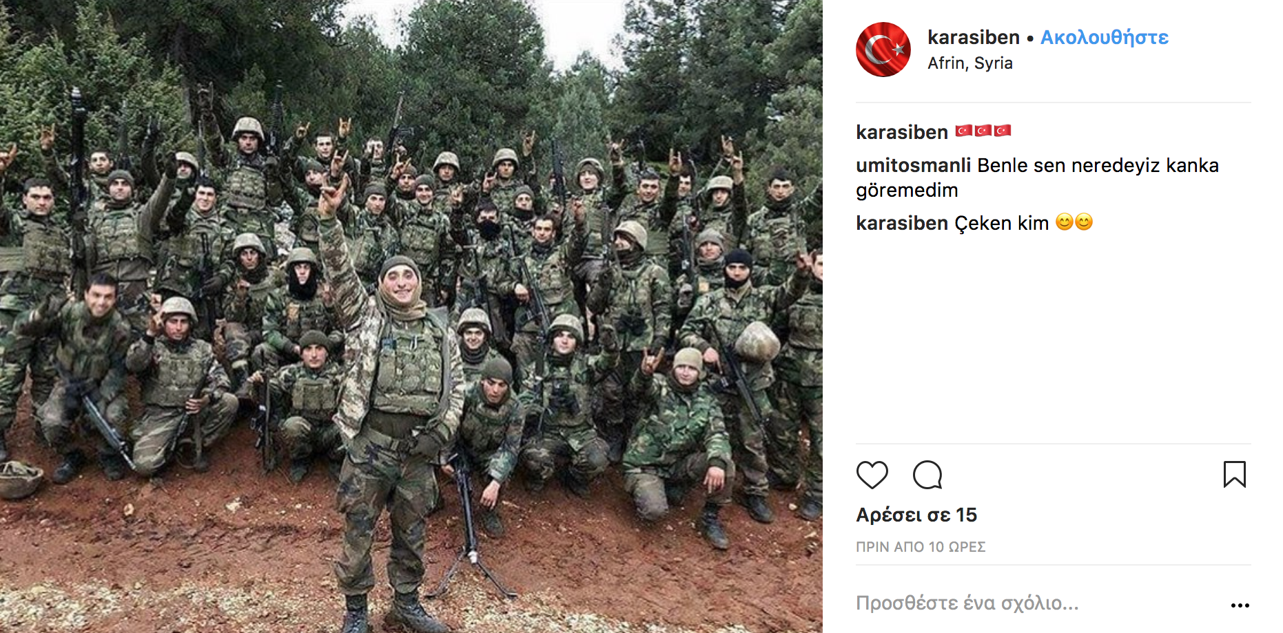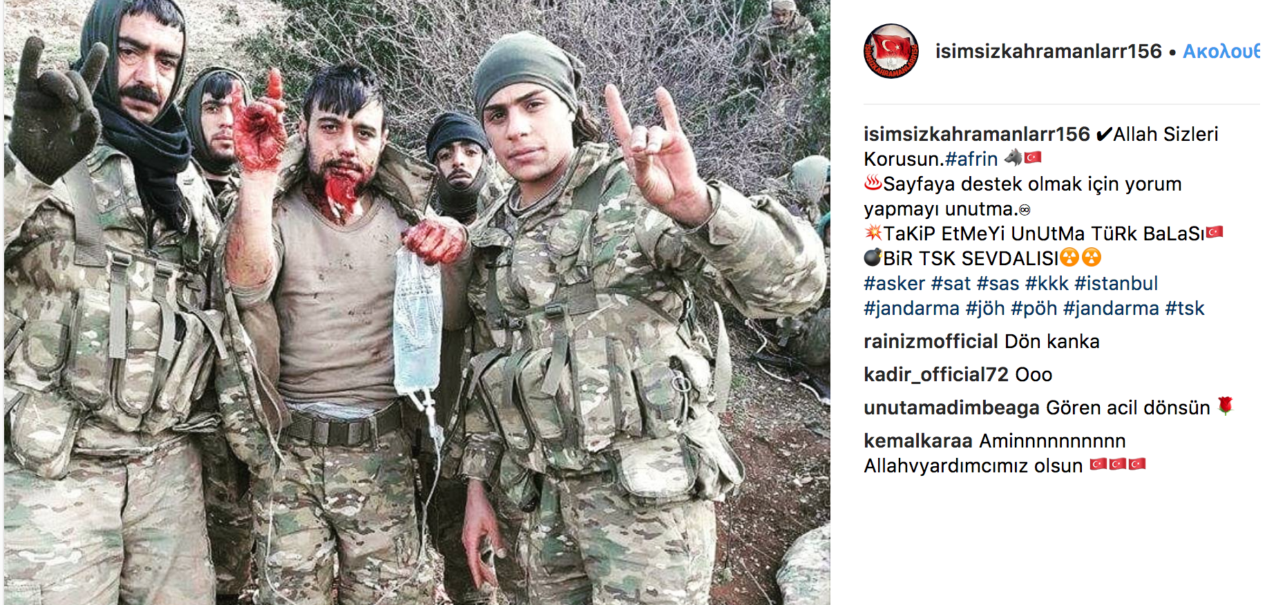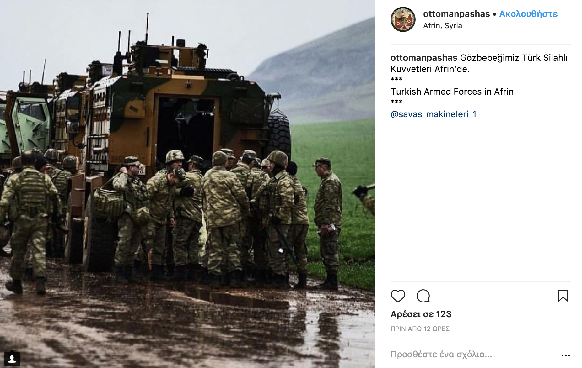 Σάλος έχει προκληθεί στο διαδίκτυο τα τελευταία 24ωρα με τις συνεχείς αναρτήσεις Τούρκων στρατιωτών στο Instagram από την Αφρίν της Συρίας κατά την διάρκεια της επιχείρησης «Κλάδος Ελαίας» με τους επιτελείς τους να «πονοκεφαλιάζουν» από αυτό το γεγονός.