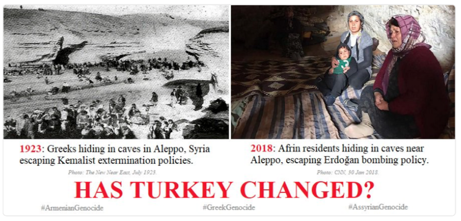 Στις ίδιες σπηλιές που έσπευσαν να κρυφτούν το 1923 Έλληνες για να γλιτώσουν από τους διωγμούς του Κεμάλ σπεύδουν σήμερα να κρυφτούν οι Κούρδοι κάτοικοι της Αφρίν για να γλιτώσουν.