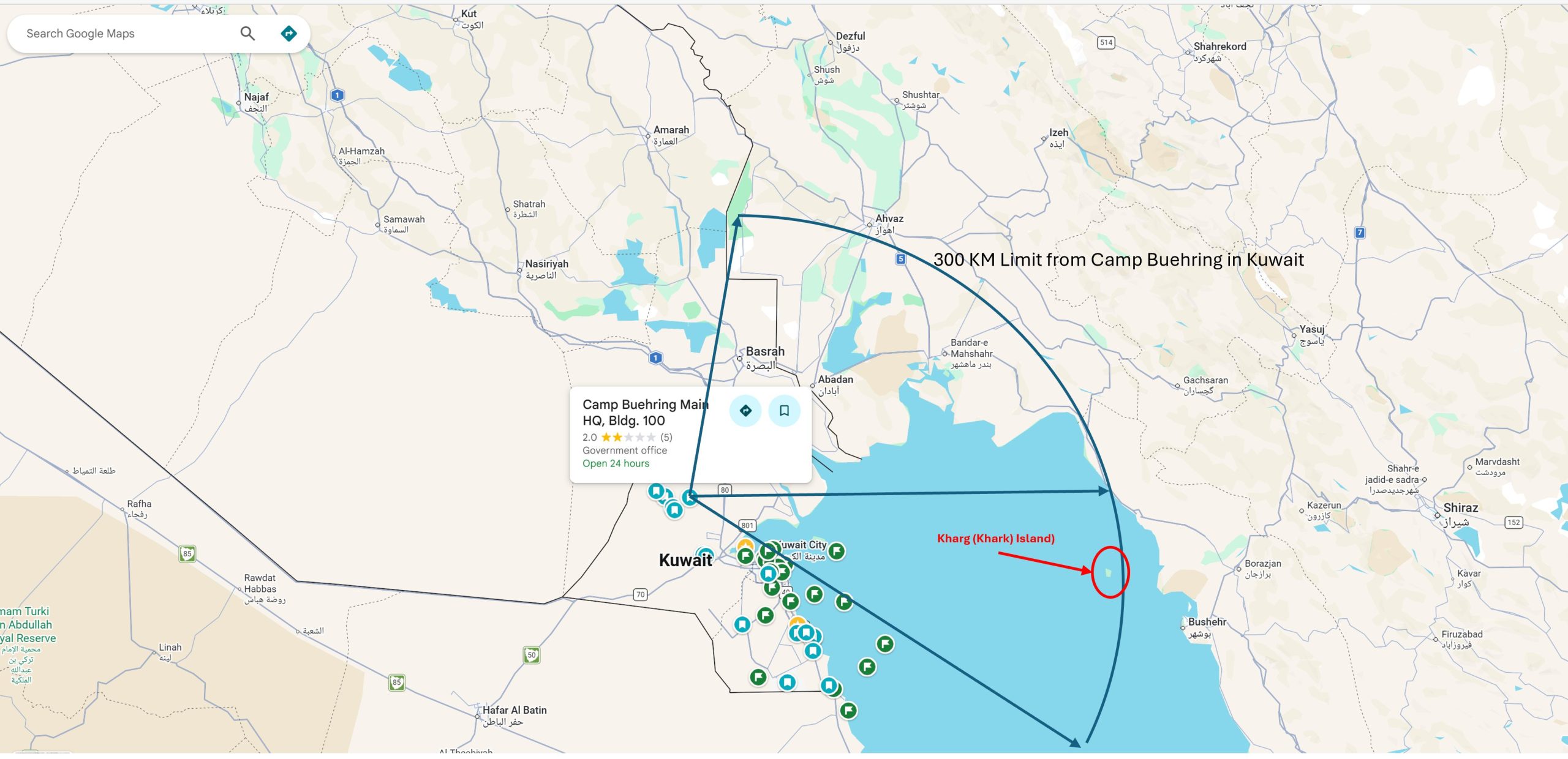 Πιθανό σημείο εκτόξευσης είναι το Camp Buehring και ο χάρτης που ακολουθεί δείχνει το όριο εμβέλειας εντός του Ιράν.