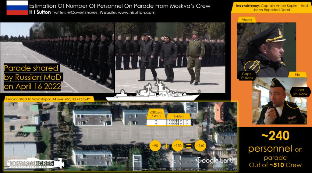 Με βάση την ανάλυση των φωτογραφιών, εκτιμά ότι ήταν παρόντες περίπου 90 αξιωματικοί και 130 ναύτες. Αυτό προϋποθέτει δύο σειρές ίσων αριθμών. Σημειώνει ότι πιθανώς θα προκύψουν και άλλες εκτιμήσεις, αλλά σε γενικές γραμμές φαίνεται να είναι αριθμητικά το μισό πλήρωμα του «Moskva».