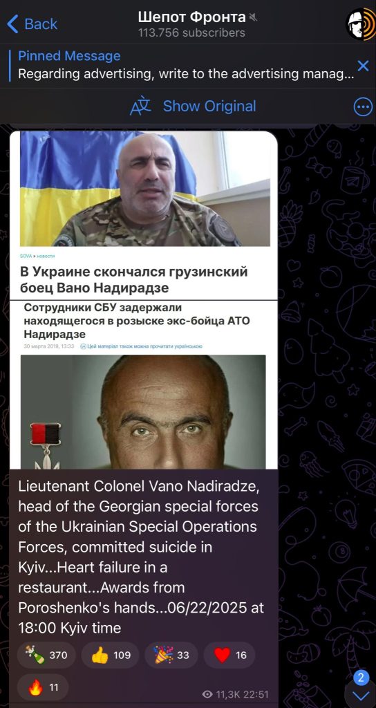 Ο αντισυνταγματάρχης Βάνο Ναντιράτζε – ο οποίος ήταν ο επικεφαλής των Γεωργιανών μισθοφόρων του ουκρανικού Στρατού – αυτοκτόνησε την Κυριακή στις 22 Ιουνίου, σύμφωνα με πληροφορίες που διέρρευσαν στην πλατφόρμα του Telegram.